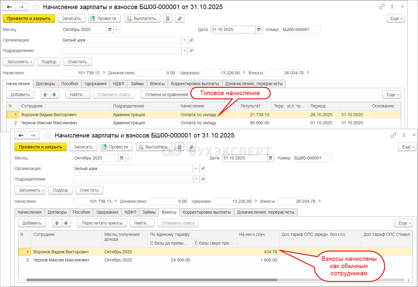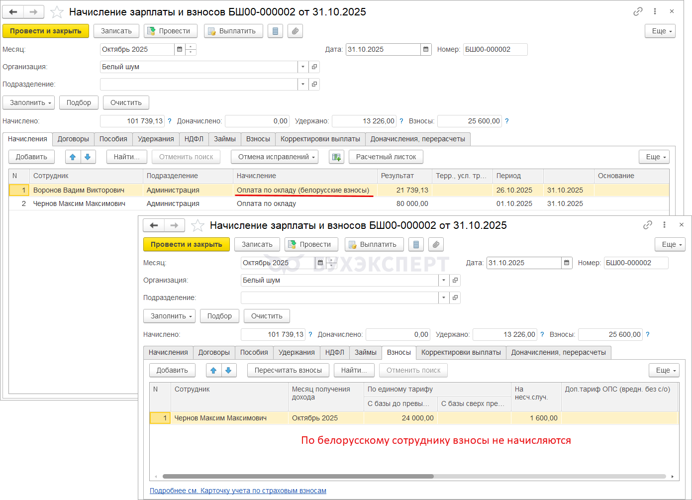 - Если белорусский сотрудник выбрал российское законодательство или не писал заявление выборе — взносы на травматизм надо начислить. В этом случае при расчете его зарплаты применяем те же начисления, что и по другим сотрудникам — программа начислит взносы на травматизм как обычно.