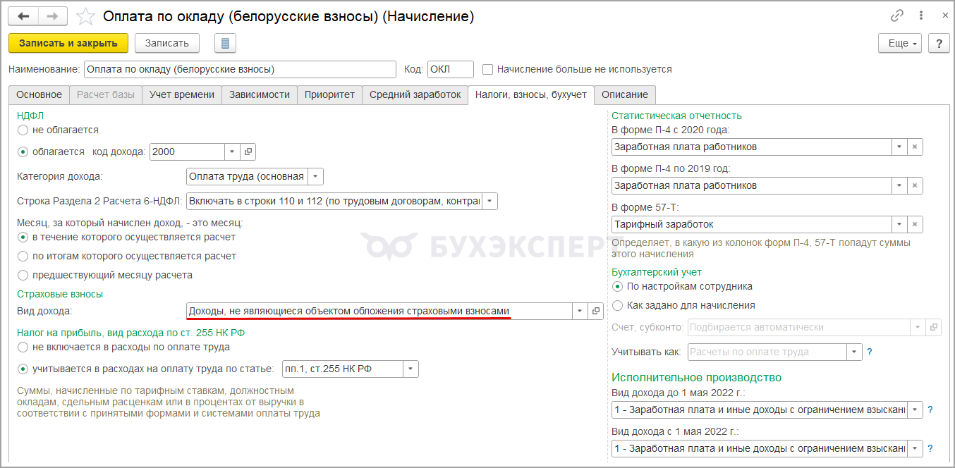 - Если сотрудник выбрал белорусское законодательство — взносы на травматизм начислять не будем. Для этого придется создавать отдельные виды начислений (для оплаты по окладу, отпуска, премий и других). Для каждого из них в настройках указываем вид доходов по страховым взносам Доходы, не являющиеся объектом обложения страховыми взносами.