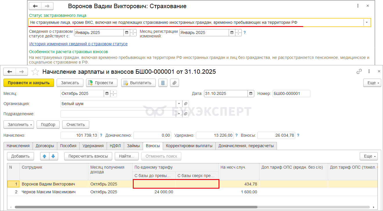 Для расчета страховых взносов устанавливаем сотруднику статус Не страхуемые лица, кроме ВКС, включая не подлежащих страхованию иностранных граждан, временно пребывающих на территории РФ. В этом случае страховые взносы начисляться не будут.