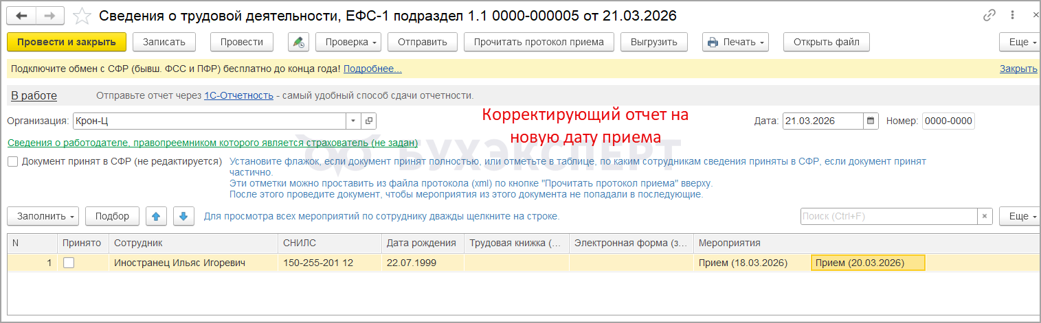 И подаем корректировку ЕФС-1 подраздела 1.1 с актуальной датой — Корректировка ЕФС-1 Подраздел 1.1.