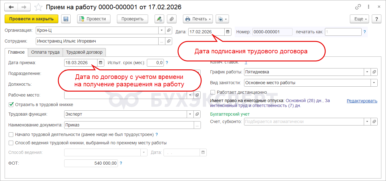 Чтобы не нарушить сроки подачи подраздела 1.1 ЕФС-1 и уведомления о заключении трудового договора с иностранным сотрудником, при заключении договора лучше заранее прописать дату начала работы с запасом — с учетом времени оформления разрешения на работу. В ЗУП 3.1 в Приеме на работу (Кадры — Приемы, переводы, увольнения) указываем эту же дату.