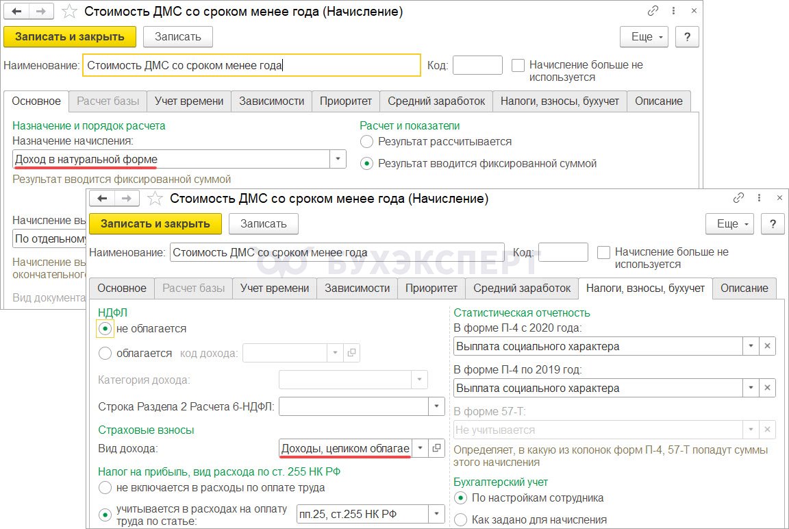 Создадим начисление с назначением Доход в натуральной форме и пропишем в настройках, что оно облагается взносами.