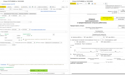 Не совсем понятен механизм первичных документов: например, в док Отпуск указал первичный документ (Приказ на отпуск), его № и дату, а в печатную форму «Приказ о предоставлении отпуска Т-6» все равно выходит значение из поля «Номер».