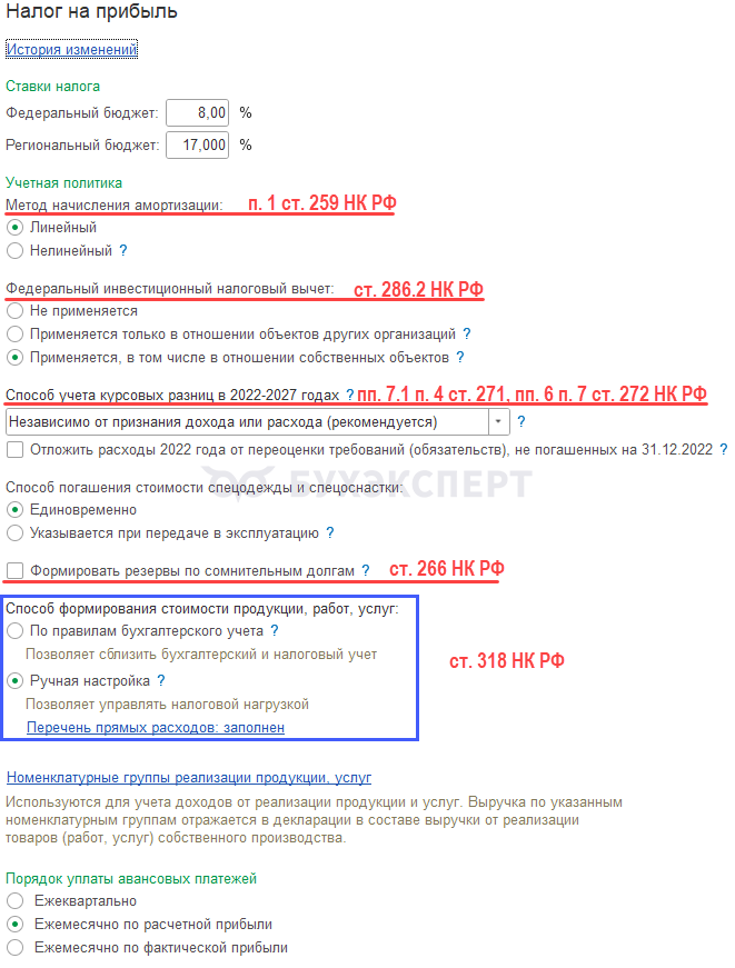 Подробнее Учетная политика по НУ: вкладка Налог на прибыль
