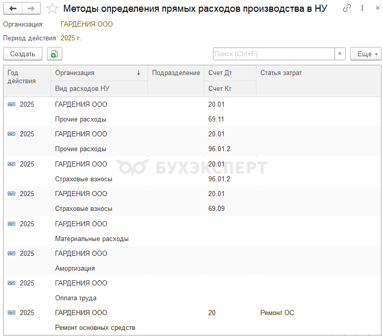 Если выбран Способ формирования стоимости продукции, работ, услуг — Ручная настройка, проверьте перечень прямых расходов.