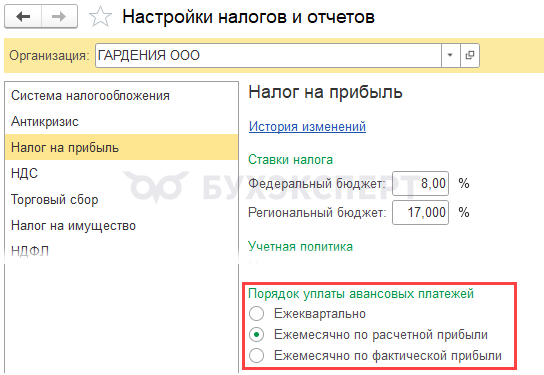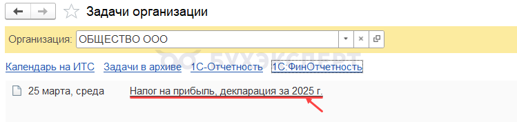 Чтобы в Списке задач информация о сдаче отчетности и уплате авансового платежа по налогу на прибыль отражалась корректно, настройте порядок уплаты авансовых платежей (Главное — Налоги и отчеты — Налог на прибыль).
