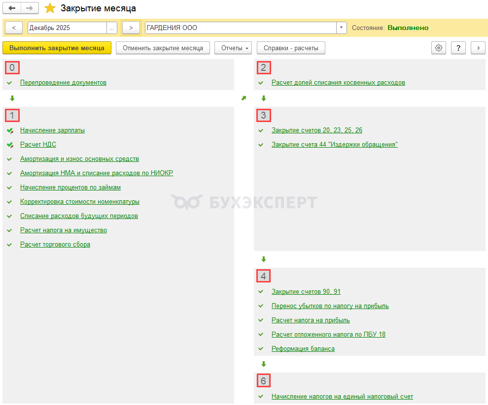 Регламентные операции выполняются последовательно, блок за блоком из процедуры Закрытие месяца (Операции — Закрытие месяца).