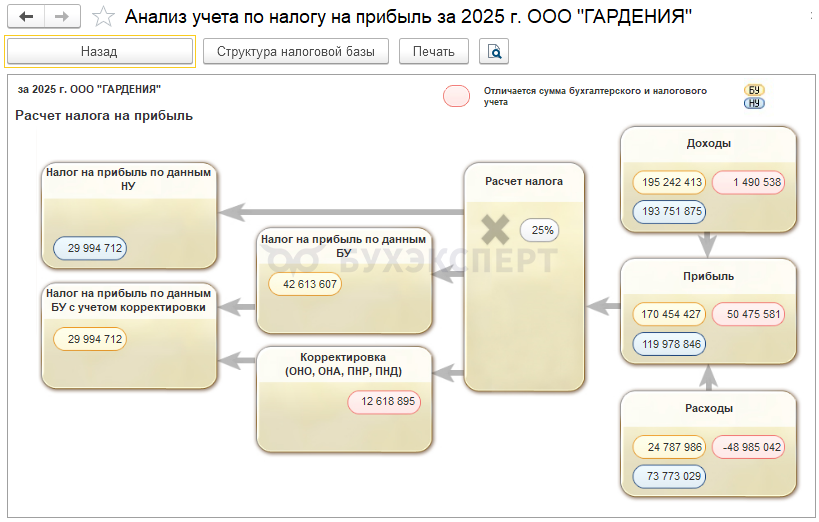 Проверьте настройки по налогу на прибыль в разделе Главное — Налоги и отчеты — История изменений — 2025.