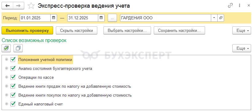 - экспресс-проверку учета — максимальная аналитика в настройках: Отчеты — Экспресс-проверка