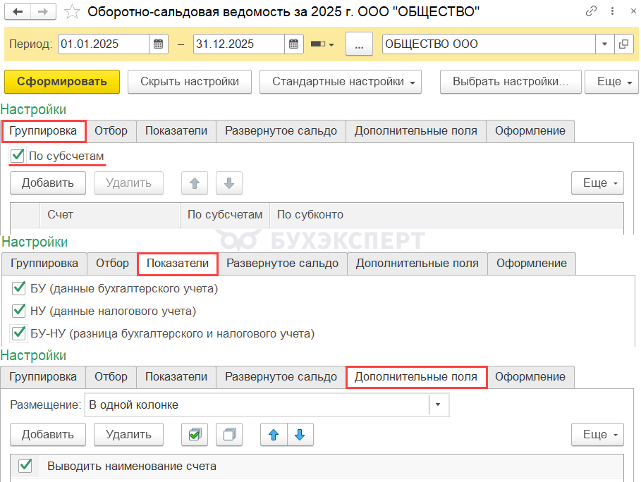 - ОСВ с максимальной аналитикой по всем счетам в показателях БУ, НУ, БУ-НУ (Отчеты – Оборотно-сальдовая ведомость)