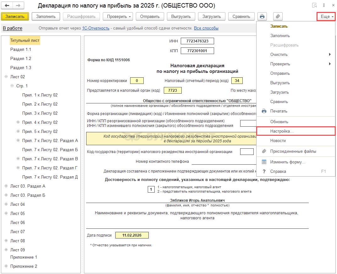 После создания декларации по прибыли настройте ее состав в форме заполнения через Еще — Настройка.