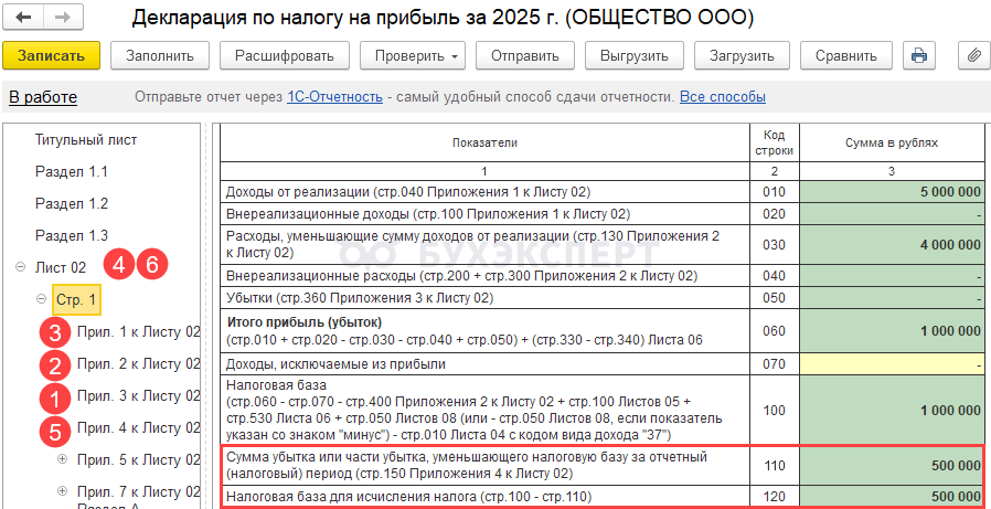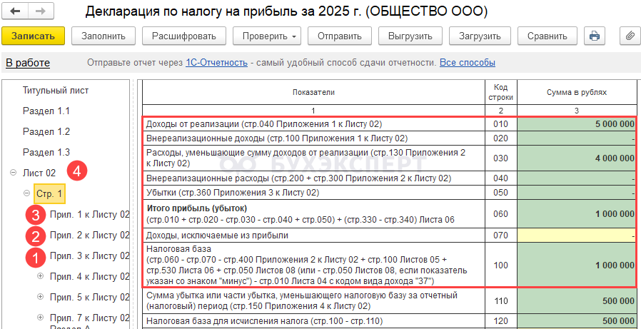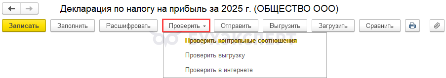 Мы рассмотрели, как в 1С 8.3 Бухгалтерия составить декларацию по налогу на прибыль за 2025, сроки уплаты налога на прибыль за 2025, как проверить в 1С декларацию и отправить в ИФНС.