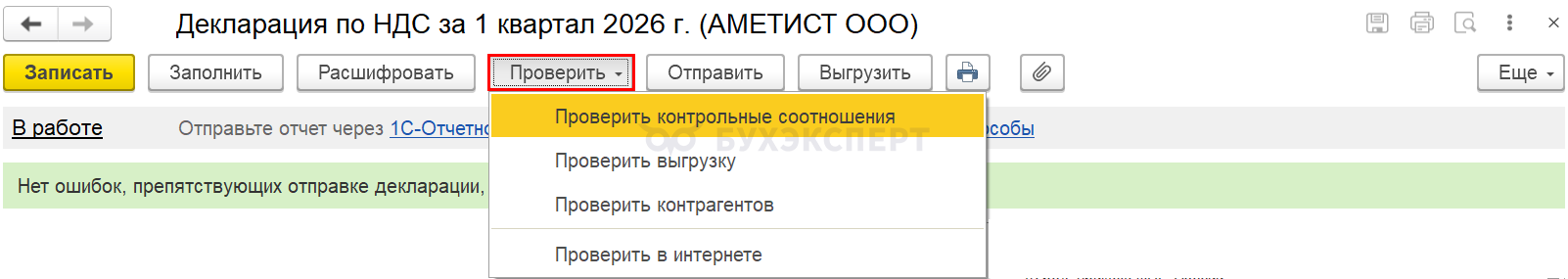 Отправьте отчетность в налоговый орган после успешного выполнения всех проверок через Отправить (при подключенной 1С-Отчетности)/ Выгрузить (для отправки другим оператором).