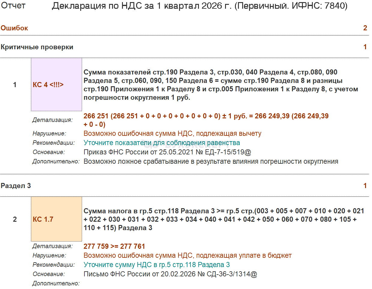 При возникновении ошибки проанализируйте данные по декларации: установите величину расхождений и их причину. Если причиной является округление, а не ошибки, декларацию можно отправить без исправлений, несмотря на предупреждение.