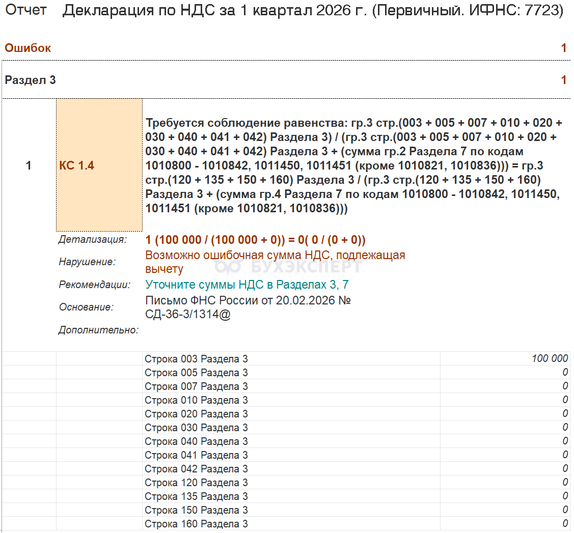 - Если в разделе 3 декларации отражена только реализация с НДС без отражения вычета НДС возникает ошибка КС 1.4