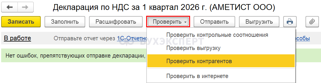 Разберем порядок представления декларации по НДС за 1 квартал 2026, а также ее алгоритм заполнения, проверки и уплаты налога в программе 1С 8.3 Бухгалтерия.