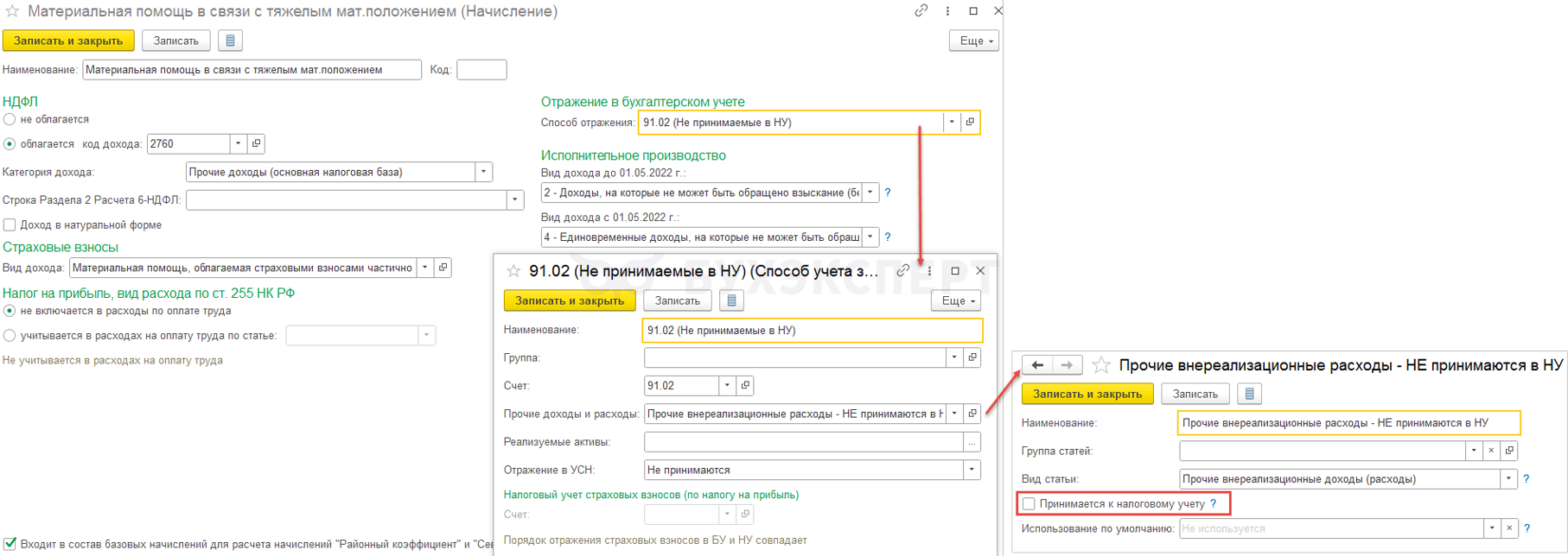 Важно создать соответствующий способ отражения, чтобы начисление было отнесено не на счета расходов по заработной плате, а на счет 91.02 «Прочие расходы», который используется во всех случаях начисления материальной помощи.
