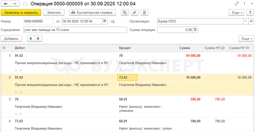 Шаг 1. Документом Операция создаем проводки - сторнируем мат. помощь и НДФЛ с нее с 70 счета и начисляем на счет 73.03
