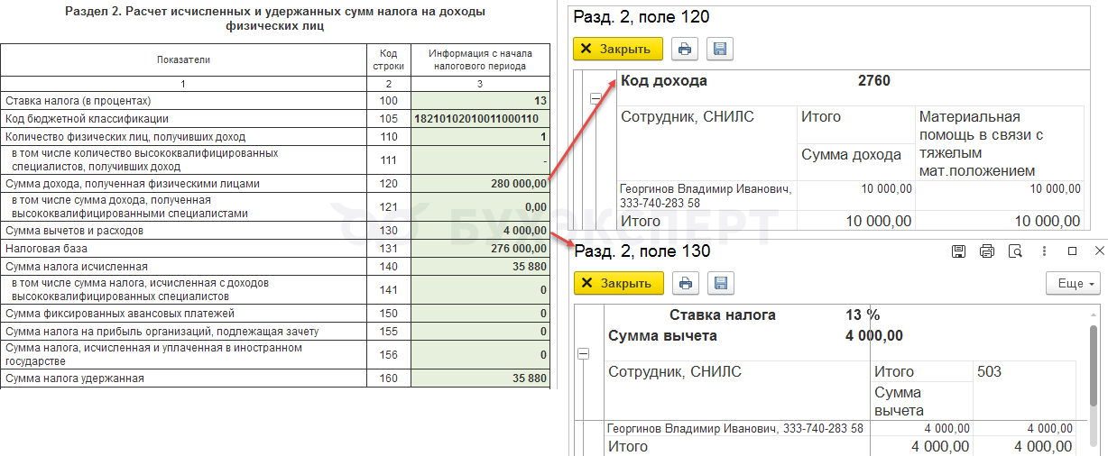 Начисленная сумма материальной помощи и вычет по ней отразятся в Разделе 2 Расчета 6-НДФЛ.