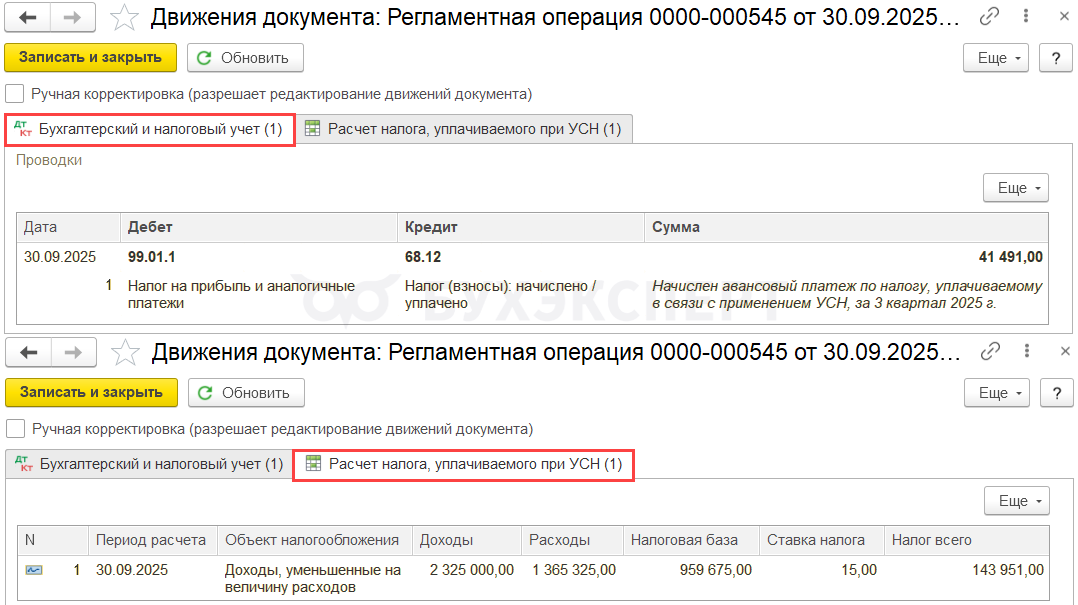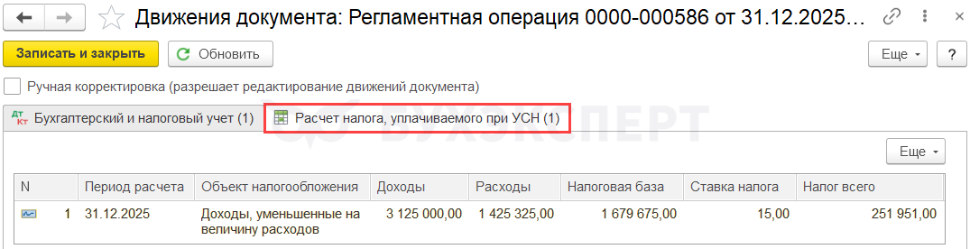 С 2026 года в 1С произошло изменение в механизме переноса начисленных налогов и взносов на ЕНС. Налоговая обязанность по УСН на счете 68.90 формируется автоматически: