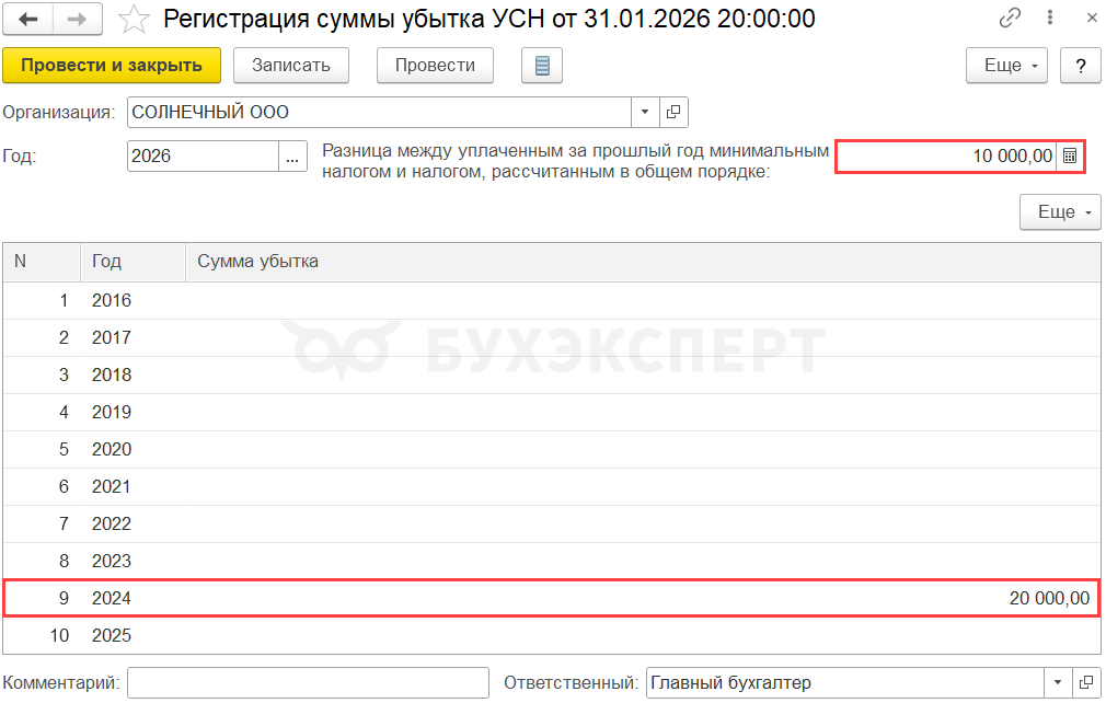 Зарегистрируйте убытки прошлых лет и «разницу» по минимальному налогу (УСН доходы-расходы, 15%) в Операции – Регистрация суммы убытка УСН.