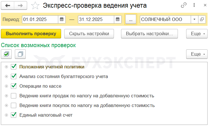 Выполните экспресс-проверку учета с максимальной аналитикой в Отчеты — Экспресс-проверка.
