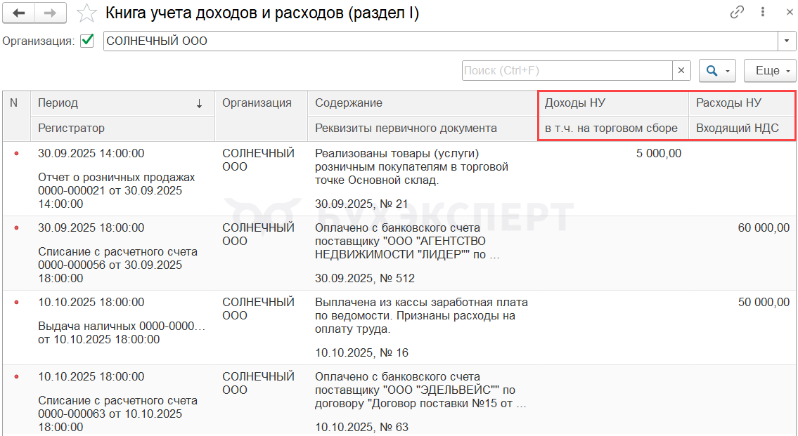 Источник для заполнения КУДиР: регистры УСН — Книга учета доходов и расходов (раздел I) и т. д.