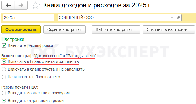 Для проверки доходов, не вошедших в налоговую базу, установите в настройках вывод граф Доходы всего и Расходы всего.