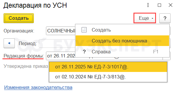 В разделе Отчеты — 1С-Отчетность декларацию можно сформировать без использования Помощника по УСН, а также выбрать форму. ФНС рекомендует отчитаться по новой форме.