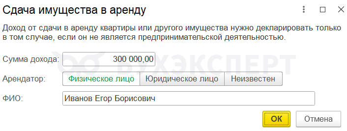 Заполните данные по доходу, которого нет в базе, вручную (например, сдача имущества в аренду).