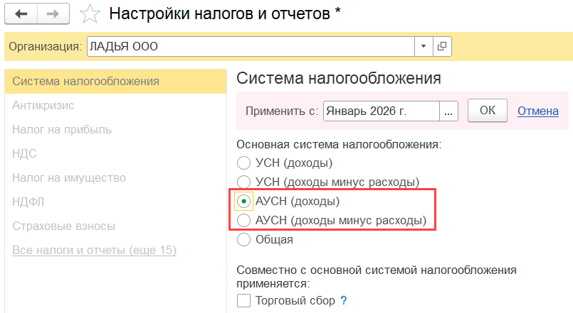 Как перейти на АУСН в Главное — Настройки — Налоги и отчеты — Система налогообложения. Переход возможен с любого месяца.