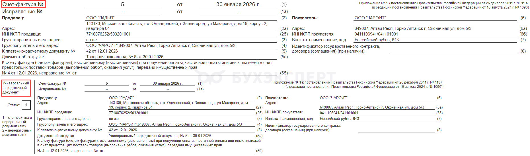 Образец УПД — заполненный бланк