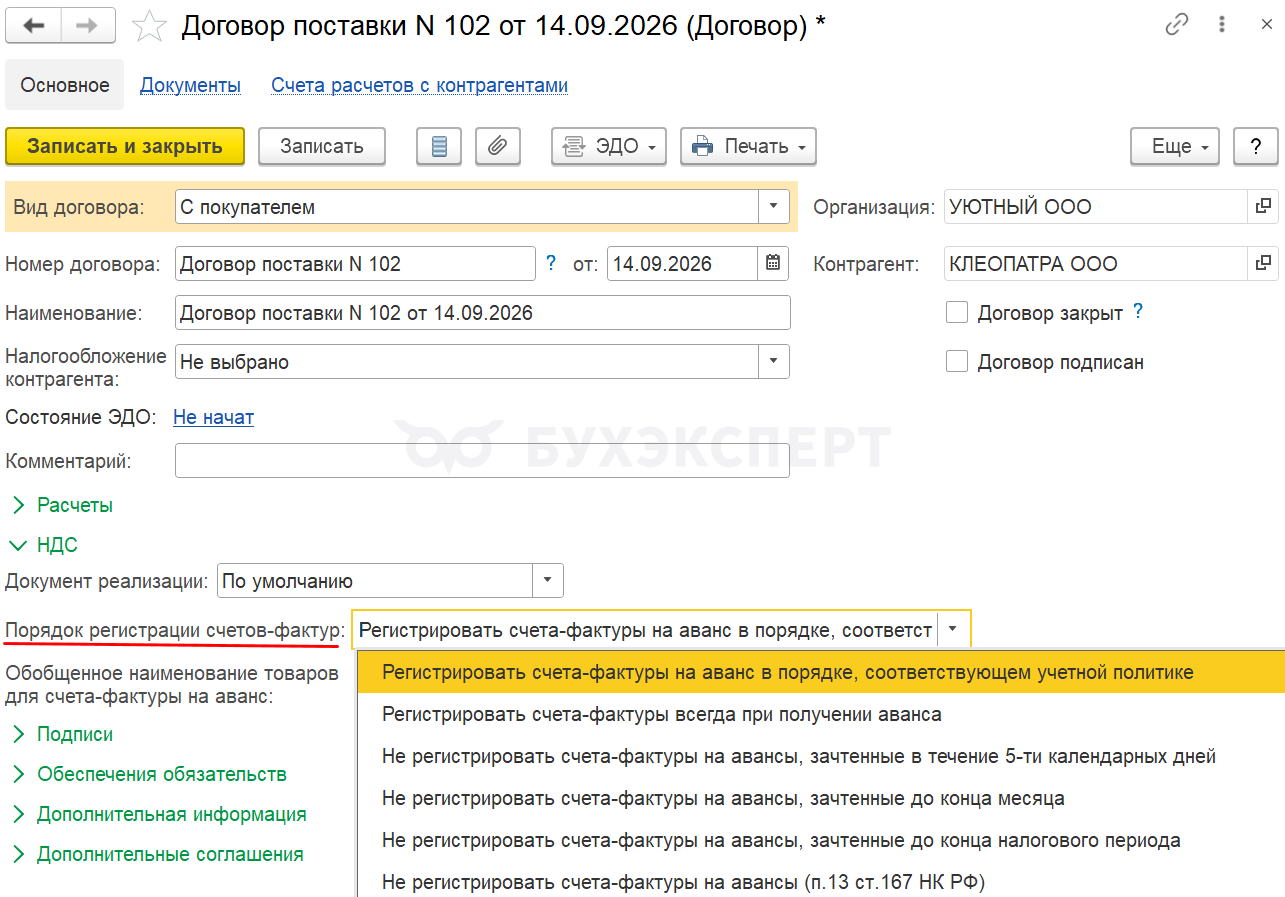 Обычно счета-фактуры на аванс выставляются в течении 5 дней после получения оплаты (п. 3 ст. 168 НК РФ). Но бывают случаи, когда допустимо использовать другой порядок. Например, при долгосрочных непрерывных поставках контрагенту можно не выставлять счета-фактуры в течении месяца, а оформить документ только на сумму незачтенного аванса. Поэтому в настройках учетной политики по НДС необходимо настроить Порядок регистрации счетов-фактур на аванс, который будет использован по умолчанию.