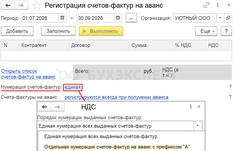В 1С можно присваивать префикс «А» ко всем счетам-фактурам на аванс. Для настройки нумерации перейдите в раздел Банк и касса — Счет фактуры на аванс.