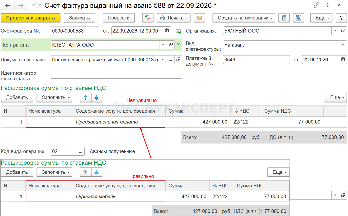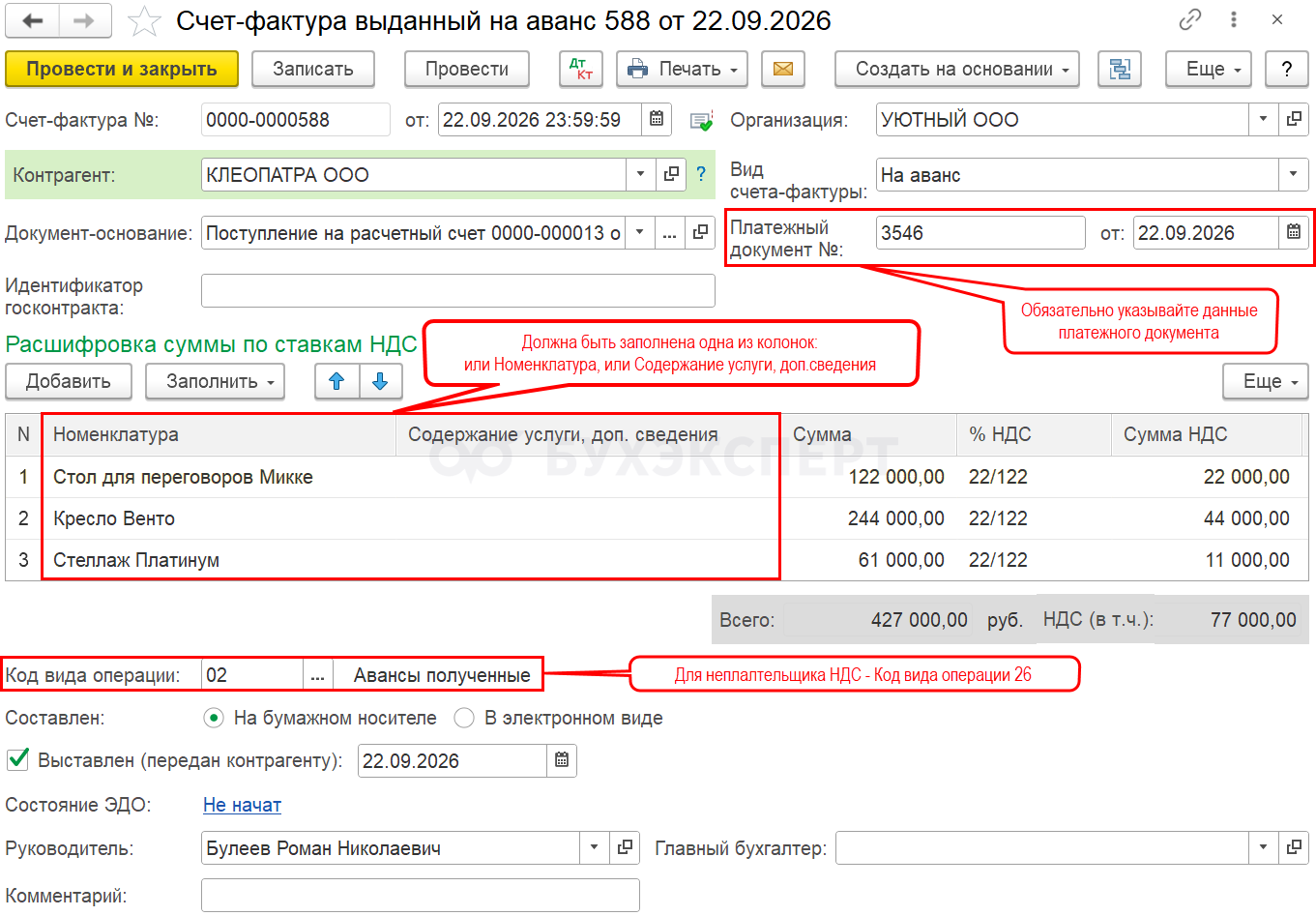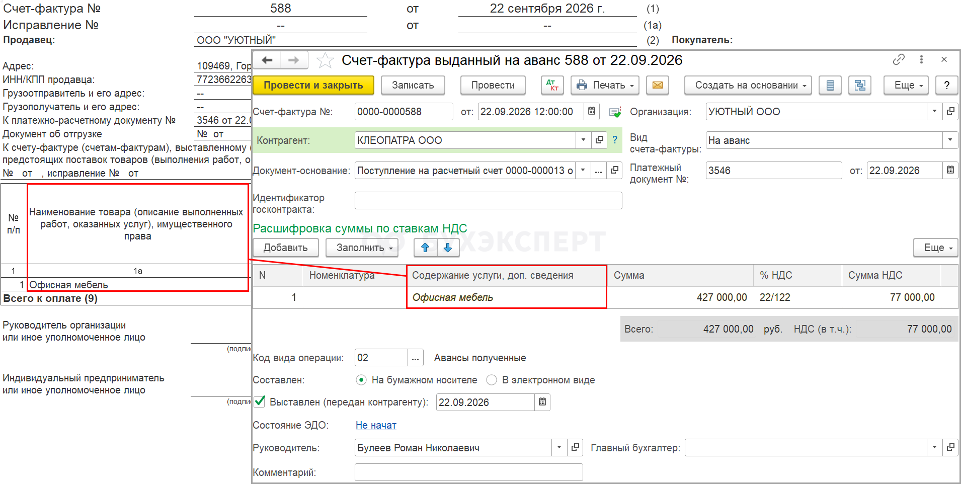 Рассмотрим основные нюансы заполнения счета-фактуры на аванс в 1С 8.3 для корректного оформления печатного бланка.