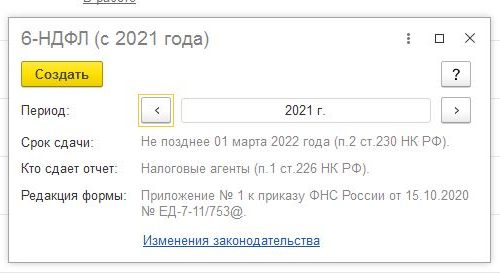 Новая форма 6-НДФЛ реализована в ЗУП 3.1.20.71 / 3.1.18.305. Чтобы создать 6-НДФЛ за 2021 год по новой форме, дата компьютера / сервера должна быть 01.01.2022 г. или позднее. Тогда в окне создания отчета появится поле для выбора редакции формы.
