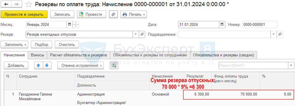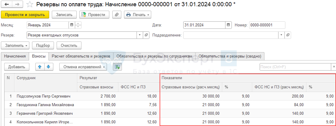 - Исчислено – сумма резерва, рассчитанная на вкладках Начисления и Взносы