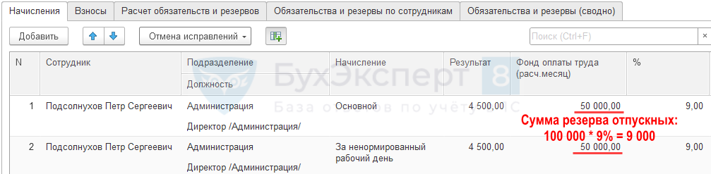 Если сотруднику назначены несколько видов отпуска, то резерв для каждого вида отпуска рассчитывается в отдельной строке.