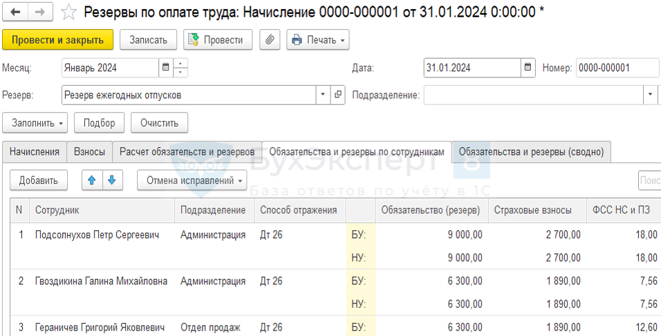 Значения из колонки Зачтено далее отражаются в разрезе сотрудников, подразделений и способов отражения на вкладке Обязательства и резервы по сотрудникам и в итоге формируют данные в разрезе подразделений и способов отражения на вкладке Обязательства и резервы (сводно). На основании данных именно с этой вкладки после синхронизации между 1С ЗУП 3 и 1С Бухгалтерия 3 формируются проводки по документу Резервы по оплате труда.