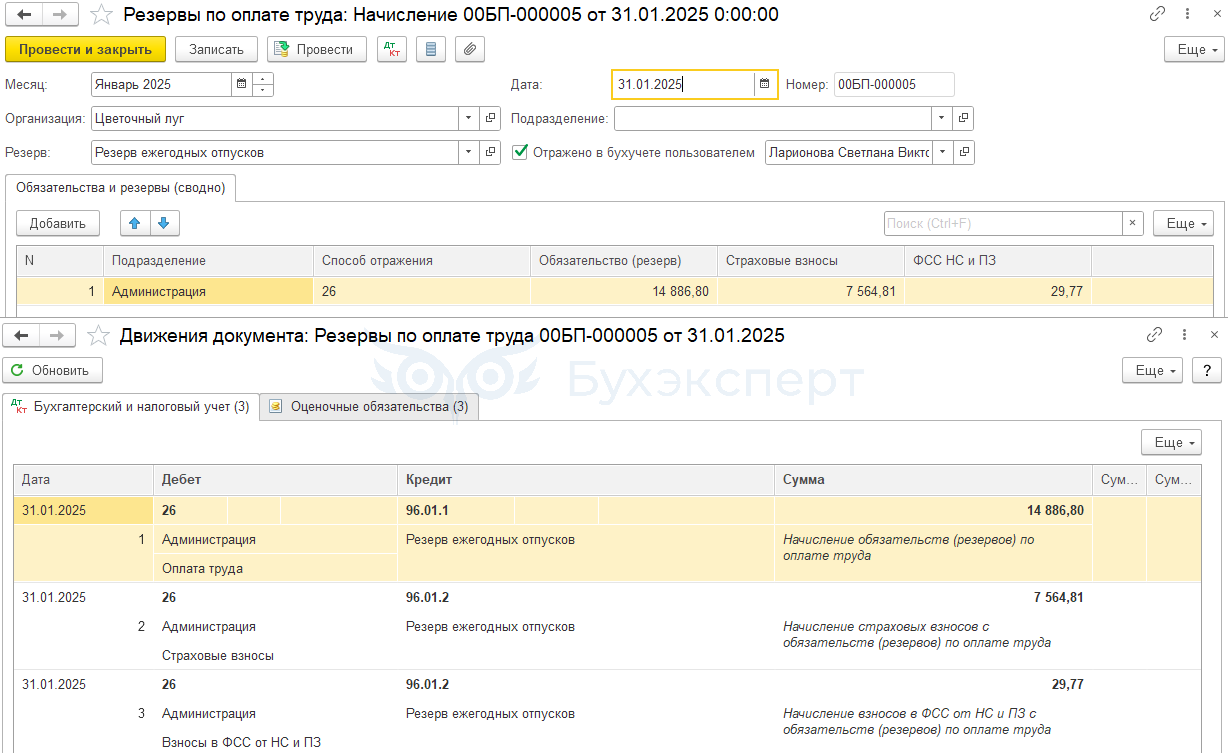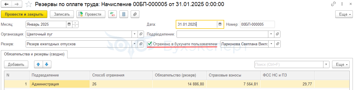 - Документ Резервы по оплате труда с типом Инвентаризация