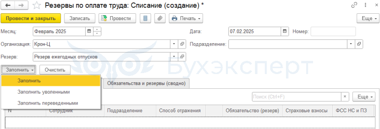 - Заполнить уволенными – попадают сотрудники, уволенные в месяце ввода документа, если по ним не списался остаток резерва
