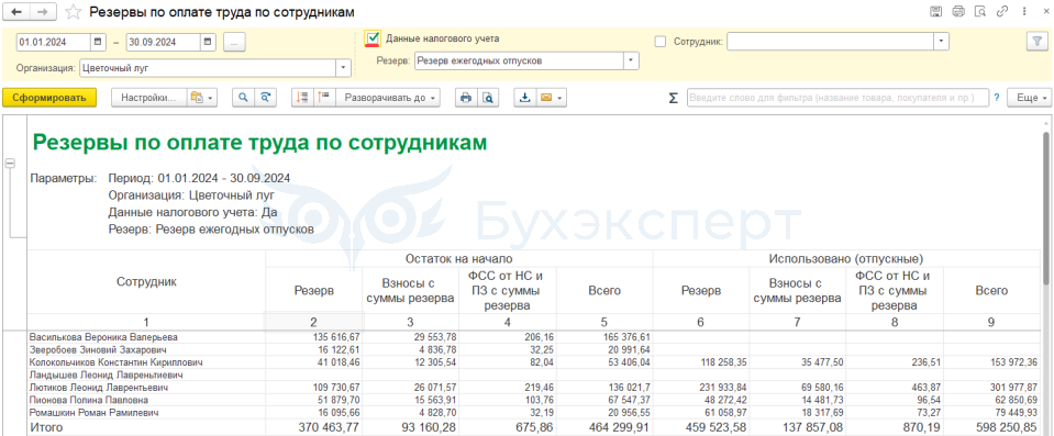 - Отчет Резервы по оплате труда по сотрудникам — сумма резерва по сотрудникам в БУ: