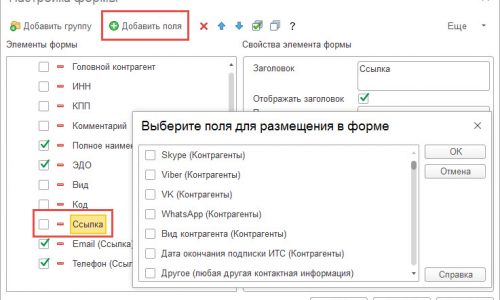 Здравствуйте! Необходимо открыть Ещё — изменить форму, далее установить курсор на строчку «Ссылка» нажать «Добавить поля». Откроется окно, где будут доступны в том числе и доп. реквизиты.