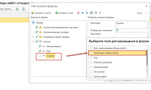 Не дописал про Ссылка — Добавить поля. Я там именно и смотрел. Добавленного реквизита не видно. Прилагаю скриншоты. Попробуйте воспроизвести именно со справочником Виды работ.