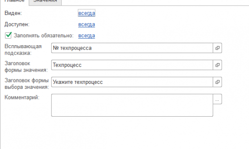 Мы видим, три наших добавленных реквизита. В первом реквизите — поле с кнопкой выбора значений, во втором — возможность установить галочку, в третьем — обычное текстовое поле и наши всплывающие подсказки, которые прописали в настройках.
