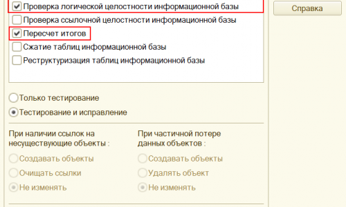 При тестировании и исправлении и обнаружении ссылок на несуществующие объекты в 1С предлагается три варианта действия — создать объект, очистить ссылку или не изменять, при обнаружении частично потерянных данных объекта — создать, удалить объект, или не изменять его. При выполнении действия: