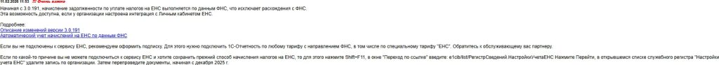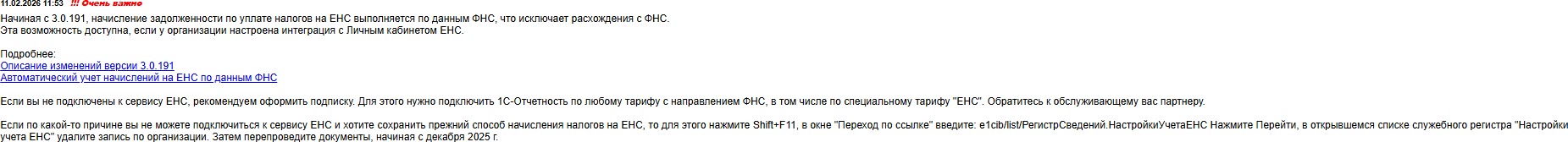 Дело в том, что если когда-то у организации был подключен (и уже закончился) тариф «Промо-ЕНС» (или закончилась подписка на 1с-Отчетность, в составе которой использовалась, в том числе, возможность получения данных о состоянии ЕНС из ЛК ФНС) — то в РС «Состояние подключения ЕНС», скорее всего, остался признак «Интеграция подключена». При переходе на 3.0.191 в таком случае — создастся запись в РС «Настройки учета ЕНС» по данной организации с началом учета по данным ФНС — 01/01/2026. Как следствие — все проводки, что отражали «начисление на ЕНС» в 2026 году типа 68.01 — 68.90 — пропадут, и не будут формироваться по новым документам.