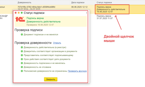 Мария, эти полномочия текстом прописаны, поэтому система не может их автоматически проверить. Нажмите на гиперссылку Проверить вручную. Проставьте признак, что все хорошо, доверенность надежная. После сохранения заново откройте Текущие дела ЭДО и проверьте, поменялся ли цвет строки.