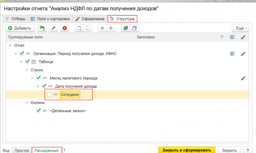 Отчет можно сформировать без разбивки по сотрудникам. По кнопке Настройки выберите Вид — Расширенный на вкладке Структура снимите флажок — Сотрудники.