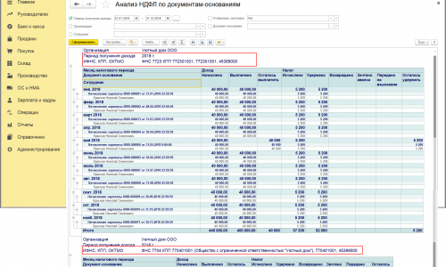 Сформируйте отчет Анализ НДФЛ по документам-основания. Раздел Зарплата и кадры — Зарплат — Отчеты по зарплате — Анализ НДФЛ по документам-основания. Посмотрите какие документы отражаются по старому и новому КПП